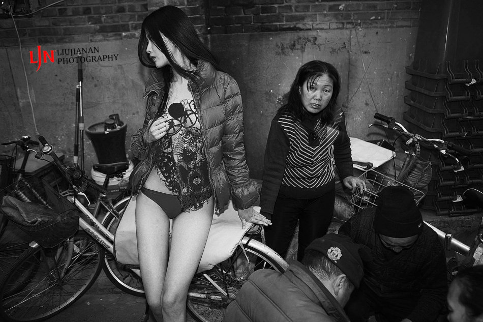 除了圍觀的人,寒冷對模特也是非常大的考驗!冬天的北京氣溫很低。
